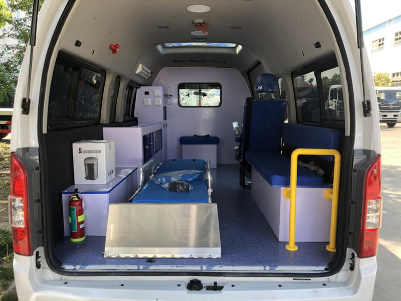 醫療艙左側平窗組合醫療器械柜,隔斷后藥品柜,右側1個正向單人座椅,后部2人位長條座椅及安全帶